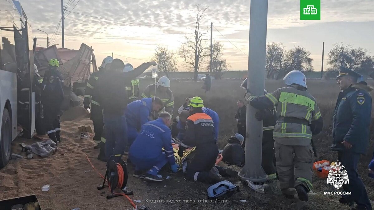 [ Смотреть видео на сайте НТВ ] Следственный комитет уточнил, что в крупном ДТП с участием автобуса и грузовика в Крыму пострадали 20 человек, в том числе восемь несовершеннолетних. Восемь пострадавших получили тяжелые травмы. Шесть человек погибли. Напомним, крупная авария произошла сегодня утром на Евпаторийском шоссе в районе села Укромное. Автобус с пассажирами врезался в стоявший на обочине грузовик. Водитель автобуса позднее заявил, что в момент ДТП его ослепило солнце и он не заметил препятствия. Как сообщили в региональном учреждении «Крым-спас», кузов грузовика пробил лобовое стекло влетевшего в него автобуса, смяв его переднюю часть и наехав на пассажирские сидения. Спасателям пришлось поднимать грузовик, чтобы помочь пострадавшим и извлечь тела погибших. На место аварии начали прибывать родственники пострадавших в ДТП. Им оказывают поддержку специалисты Центра экстренной психологической помощи МЧС России. После аварии СК завел уголовное дело об оказании небезопасных услуг и