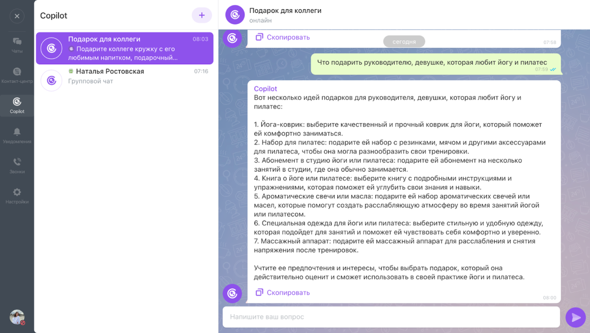 Битрикс24 CoPilot AI-ассистент, который поможет вашему бизнесу стать лучшей версией. С ИИ вы и ваши сотрудники смогут сосредоточиться на важных задачах, например, поиск новых стратегий развития, улучшить взаимодействие с клиентами, которое как правило конвертируется в прибыль, анализ данных, стратегическое планирование. На сегодняшний день искусственный интеллект является основным быстроразвивающимся трендом в ИТ. с каждым днем технологии развиваются и выходят на новый, помогают вашему бизнесу работать лучше. CoPilot станет вашим цифровым помощником для увеличения продуктивности компании. ИИ может вам помочь в CRM, задачах, новостной ленте, почте, конструкторе сайтов. Вам не нужно учиться генерить запросы для AI. В Битрикс24 создано множество готовых сценариев для ежедневной работы. Функционал Битрикс24 CoPilot В Битрикс24 разработана концепция открытого CoPilot. Вы сможете использовать языковые модели разных компаний: GigaChat, YandexCPT или приложение из Маркета. Вести диалог с искус