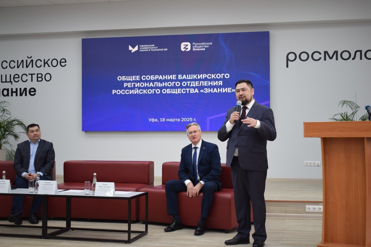 В Уфимском университете науки и технологий состоялось общее собрание Башкирского регионального отделения Российского общества «Знание». В заседании приняли участие и.о. руководителя администрации главы Башкортостана Азат Бадранов, первый заместитель премьер-министра Правительства Урал Кильсенбаев и председатель регионального отделения, ректор УУНиТ Вадим Захаров. Азат Бадранов подчеркнул, что общество «Знание» играет ключевую роль в просвещении граждан, помогая формировать мировоззрение, основанное на знаниях, патриотизме и уважении к истории. Азат Бадранов отметил важность распространения просветительской работы не только в Уфе, но и во всех районах республики. По данным директора регионального филиала Айсылу Илимбетовой, в 2024 году в Башкортостане прошло более 770 лекций, которые посетили свыше 30 тысяч человек. Организация продолжит развитие проектов «Знание. Карьера», «Знание. Наука», «Знание. Государство», «Знание. Герои» и «Знание. Лекторий», а одной из приоритетных задач 2025 г