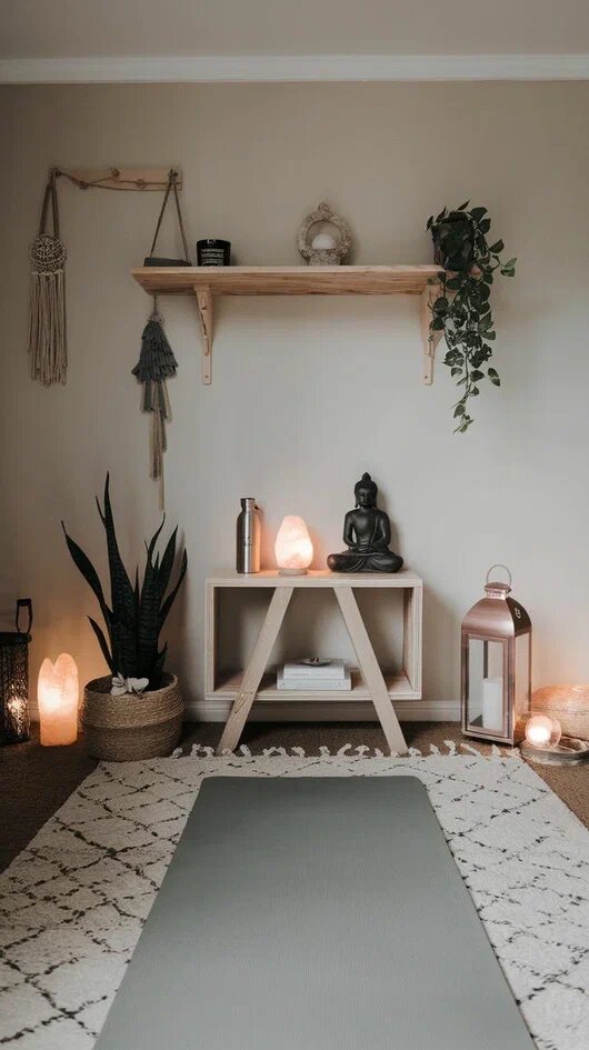 🔸 Свет: здорово, когда есть возможность расположиться в пространстве с большими окнами или на балконе, но искусственное освещение тоже подойдёт. Тем, кто занимается йогой и медитацией, стоит предусмотреть и камерное освещение, помогающее создать уют.