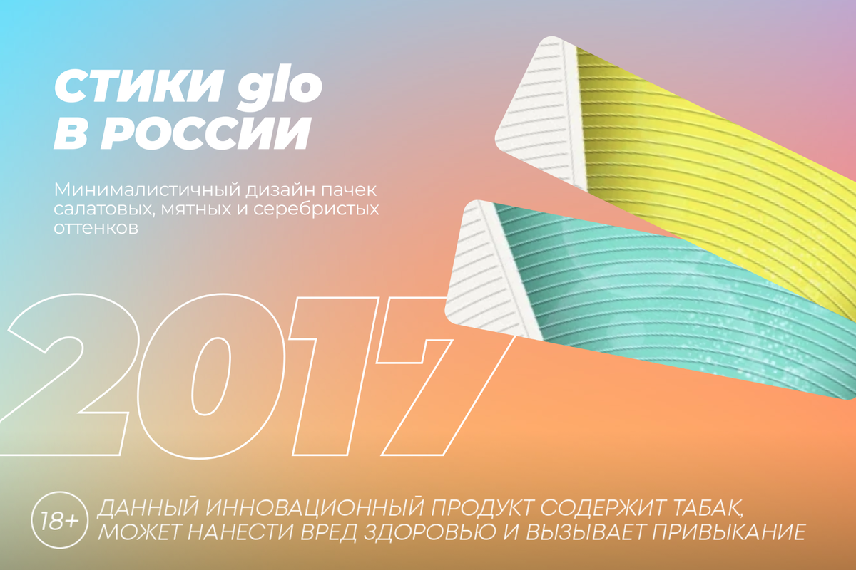 После запуска glo в России в 2017 году, изначальный дизайн упаковок стиков был сдержанным и минималистичным, он подчёркивал технологичность и новизну продукта. Основные цвета - серебристый, мятный и салатовый - отражали инновационную природу glo.