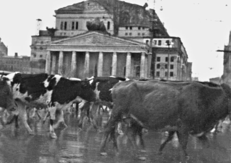 Я когда летом ездил в деревню, у соседей корову звали Терпсихора. Может тоже в театр ходила. Кадр показывает, как война перевернула жизнь: символ искусства и коровье стадо стали соседями в осаждённом городе. Кстати, Большой театр тогда тоже «эвакуировался» — его маскировали под обычный дом, чтобы сбить с толку немецких лётчиков. P.S. Если у вас в семейных архивах есть такие же удивительные снимки — делитесь! Мой тг канал в котором я пишу о своем хобби и колл