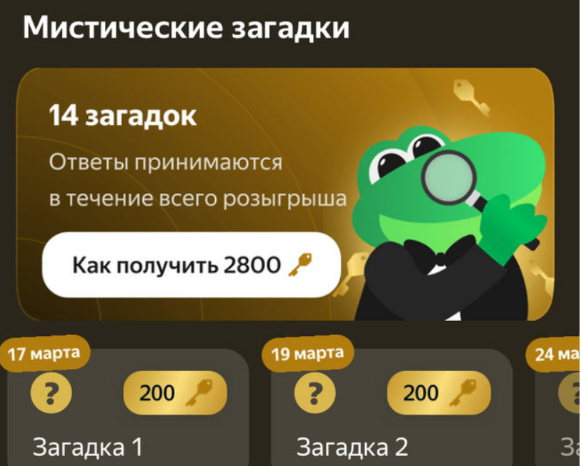 Набирает обороты новый розыгрыш в приложении Едадил. Он получил название "В поисках миллиона". Здесь есть вероятность получить миллион, но для этого нужно набрать как можно больше ключей. Разыгрывается много и других более мелких призов. Заданий много, одно из которых отгадывание загадок. За каждую отгаданную загадку начисляют 200 ключей. Первая мистическая загадка. Ответ на эту загадку: шпион. Вторая мистическая загадка. Ответ на вторую загадку: агент. Третья мистическая загадка. Ответ на третью загадку: тайна. Четвёртая мистическая загадка. Ответ на четвёртую загадку: наутилус. Пятая мистическая загадка. Ответ на пятую загадку: ключ. Шестая загадка. Ответ на шестую загадку: код. Седьмая загадка. Ответ на седьмую загадку: ниндзя. Восьмая загадка. Ответ на восьмую загадку: ученый. Девятая мистическая загадка. Ответ на загадку от 14 апреля: детектив. Десятая мистическая загадка. Правильный ответ: хакер. Мистическая загадка №11. Правильный ответ: пароль. Мистическая загадка №12. Правиль