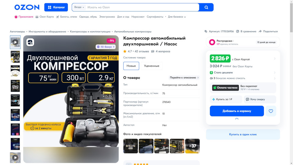 Всем привет 👋 Вот и наконец-то дошли у меня руки приобрести компрессор 😁 Долгое время катался без него, используя аккумуляторный. Да, аккумуляторный имеет место быть для подкачки, но для постоянного нахождения в машине нужно что-то проводное и посерьёзнее 👍 Заказал на озоне автомобильный компрессор в ударопрочном кейсе и с ремкомплектом. Артикул Озона: 1770126956 Приехал на пункт выдачи через пару дней 👍 Сам по себе кейс не очень компактный, то есть в бардачке его хранить мы не сможем 😁 но в багажнике он вполне удобен 👍 очень удобно, что компрессор не просто болтается в коробке или вообще без ничего, а находится в своём кейсе, также там лежит и вся его комплектация. По характеристикам компрессор выдает: 🔹 мощность – 300 Вт