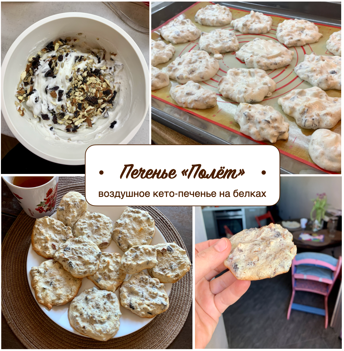Любите ли вы торт Полёт так, как люблю его я? А меренги? А десерт Павлова? Когда я нашла рецепт этого печенья, поняла, что можно не страдать по любимому десерту, а просто повторить его в кето-версии. Та-дам: воздушное, хрустящее печенье, которое добавляет радости к чаю, но не сантиметры к попе. - 3 куриных белка - лимонная кислота на кончике ножа - 30 г пудры эритрита - 100 г орехов (у меня был миндаль и семечки, но пойдут любые орехи, особенно грецкие хороши) - 20-50 г сухофруктов: у меня был чернослив, но идеально туда подходит сушеная клюква - 50 г кето-шоколада (без сахара). У меня не было, но с ним вкус интересное. - миндальная мука – 1 ст. ложка