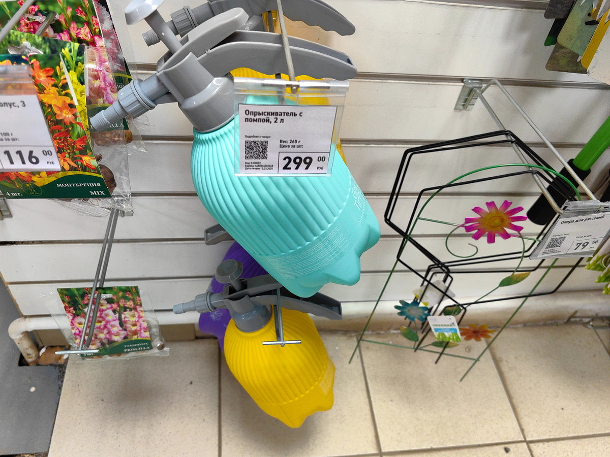 Второй день в Фикс Прайс переставляют товар, освобождают место для нового, выкладка товара. Места нет, а все привозят новинки, нашла хорошие. Появились опрыскиватели, с помпой. Легкие и вместительные, рассчитаны на 2 литра, но лучше наливать не более 1,5 литра, распыляет равномерно. Покажу поближе как выглядит, насадка пластиковая, но не тонкая. Конструкция простая, рабочая. Ручка утолщена, выдержит вес наполненного опрыскивателя. И в инструкции так и указано, что рабочий объем 1500 мл. А я все думала, что выставят на месте упаковок с удобрениями? Оказалось, что светильники для сада. Подкормку для растений перенесли выше. Садовые фигурки привезли, но это не новинки, все, что осталось с прошлого года. Появилось средство от моли, не жидкость, твердое, цилиндриками, штук десять точно внутри, может быть и больше. Просто положить в шкаф с вещами. Хватит на полгода. Запах лаванды. Упаковка 43,5р. Были как коробки, а теперь корзинки пасхальные, похожи на сумки, потому что с удлиненной ру