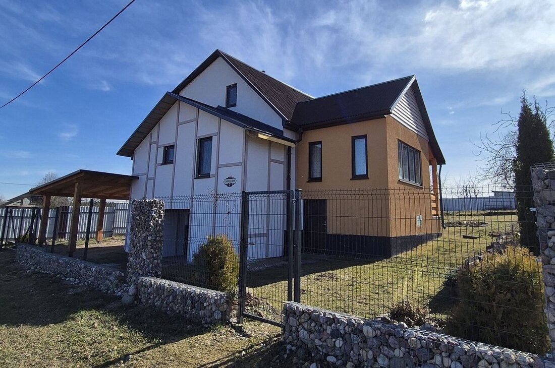 В 18 километрах от Минска, в районе между Курганом Славы и аэропортом, продается двухэтажный дом с подвалом и деревянной баней на большом участке. Ремонт вполне обычный, есть мебель и бытовая техника. Обратить внимание стоит на стоимость – за коттедж просят как за двушку. Дом находится в деревне Смольница. Добраться до нее просто по дороге в аэропорт, рядом МКАД-2 и скоростная трасса М-1. В 10 километрах – микрорайон «Сокол» с хорошей инфраструктурой, в 12 километрах - индустриальный парк «Великий камень». Дом двухэтажный с цокольным этажом, общая площадь – 178 квадратов. На двух уровнях располагаются две просторные жилые комнаты, гостиная с камином, кухня с печкой-лежанкой, санузел, остекленная веранда. В цокольном этаже – гараж и подвальное помещение для хранения сельхозпродукции и инвентаря. К дому пристроен навес для автомобиля с возможностью установки станции зарядки электромобиля. Подведено центральное водоснабжение, канализация местная. Отопление электрическое по льготному тариф