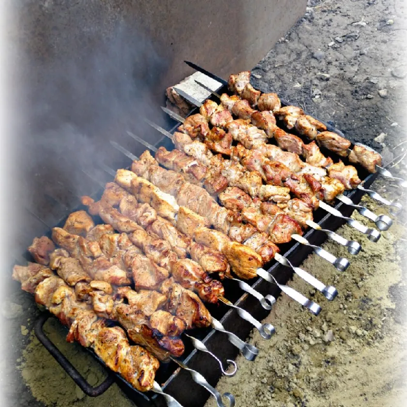 Самый вкусный, нежный и сочный шашлык получается из свинины. Готовьте его по замечательным рецептам из этой коллекции, пробуйте разные маринады для шашлыка, экспериментируйте! Лучше всего готовить шашлык из свиной шеи. Можно взять кострец или лопатку, но лопатка жестковата, ей нужен сильный маринад. Жир должен пронизывать кусочки изнутри, а не сверху. Так шашлык будет сочным и не обгорит, не получит горький привкус. Нежирное мясо получится сухим. Парное и замороженное мясо не годится для шашлыка, берите охлажденное. Из парного (только что после забоя) шашлык получится жёсткий. Из замороженного мяса тоже, потому что при разморозке вытекает много сока. Мясо режьте поперек волокон кубиками со стороной около 4 см, потому что маленькие куски высохнут, а большие не прожарятся. Не используйте уксус для маринования, он сушит мясо. Мягкому мясу вообще не требуется кислота. Для придания вкуса можно добавить фруктовый или рисовый уксус, томатный сок. На шампур мясо насаживают вдоль волокон. Кусоч