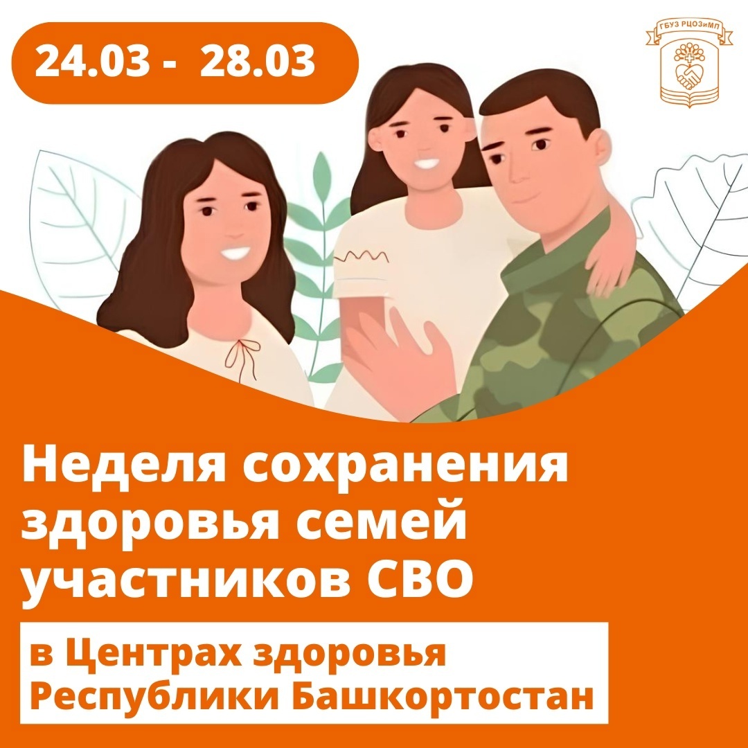 С 24 по 28 марта в центрах здоровья Республики Башкортостан пройдет Неделя сохранения здоровья семей участников СВО. Главная цель мероприятия – создать условия для укрепления здоровья и психоэмоциональной поддержки семей участников СВО, обеспечив им доступ к комплексным профилактическим консультациям, диагностике и рекомендациям по ведению здорового образа жизни. Что вас ждет: График выездных консультаций: 24 марта – ГБУЗ РБ ГБ №1 г. Октябрьский – врач-терапевт;