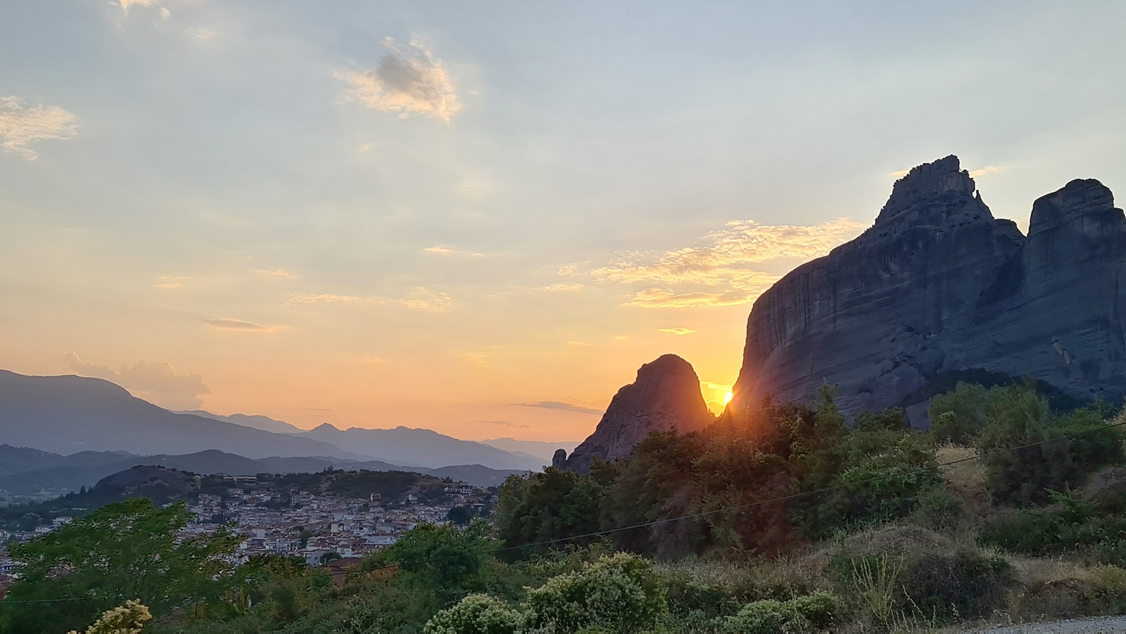 Мы выдвигаемся в пешем порядке на ужин в город Каламбаку, который под нами. Но останавливаемся, чтобы сфотографировать, как «Метеоры» ловят заходящее солнце.