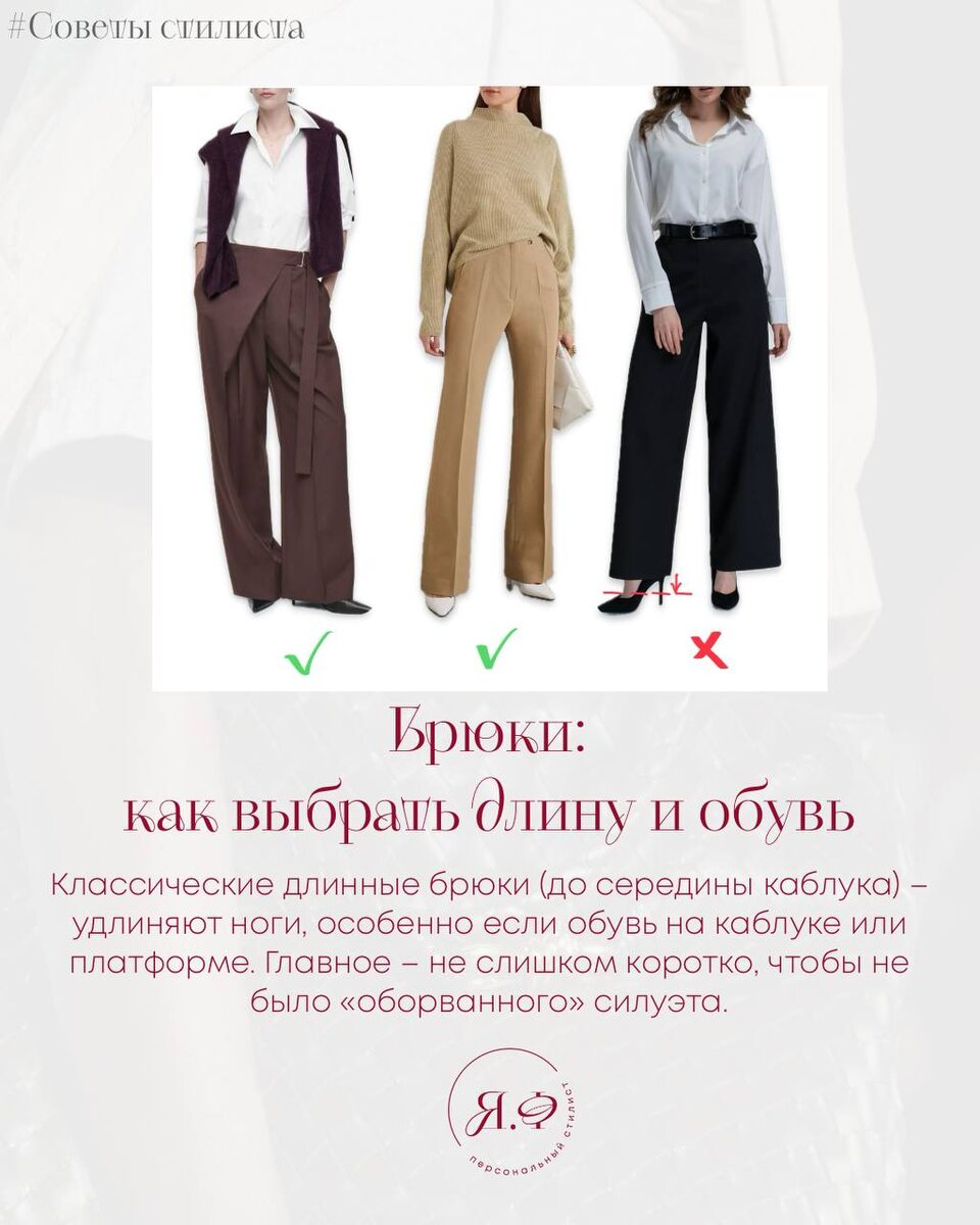 Эта статья — ответ на ваш частый вопрос! ⬇️ Как подобрать длину брюк и юбок, чтобы они подчеркивали фигуру, а не укорачивали рост? И какую обувь к ним носить? Правильная длина — это про баланс и пропорции. Она определяет, будут ли ноги выглядеть длиннее и стройнее или, наоборот, короче. В этой статье я наглядно объяснила: ✔ Как определить идеальную длину брюк и юбок под свой рост ✔ Как правильно подбирать обувь ✔ Почему форма носка играет ключевую роль Смотрите примеры в фото и сохраняйте, чтобы не допускать ошибок! ❤️ ✅ Классические длинные брюки (до середины каблука) Этот вариант зрительно вытягивает ноги, особенно если обувь тоже на каблуке. Главное — следить, чтобы брюки не были слишком короткими, иначе силуэт получится «оборванным». ✅ Прямые и зауженные брюки до щиколотки Сочетаются практически с любой обувью: лодочками, ботильонами, кедами. Чтобы визуально удлинить ноги, выбирайте обувь в тон брюк или острый мыс. ✅ Брюки 7/8 (чуть выше щиколотки) Отлично подходят невысоким дев