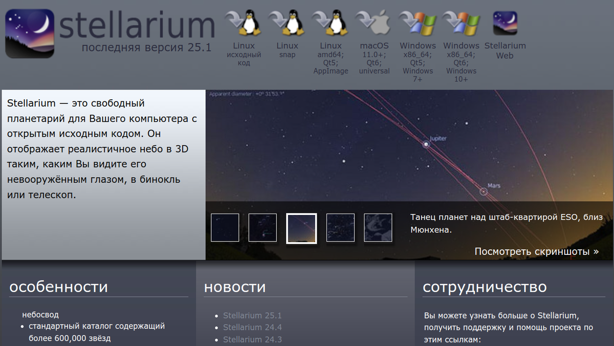 В заключение: сайт Stellarium, где можно почитать о приложении, изучить руководство пользователя (увы, на английском) и скачать нужный вам установочный файл (или перейти в веб-версию). Ссылки на мобильные приложения находятся в веб-версии. Ну и учитывайте, что дестопная версия более полная.