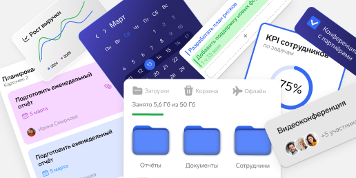 - Календарь: интеграция с Google и Яндекс Календарями, уведомления, напоминания, видеосовещания, просмотр занятости коллег.