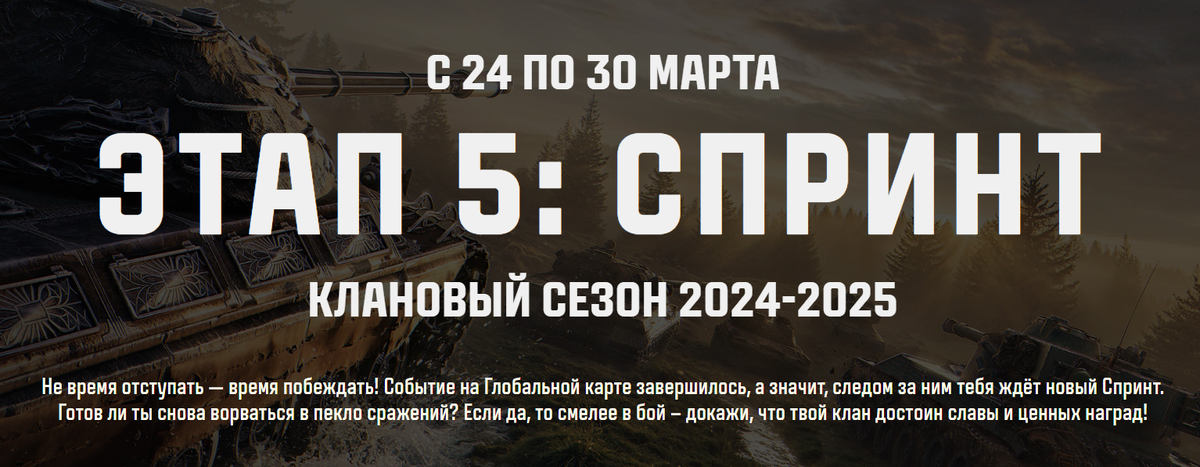 Привет, Танкист! 24 Марта стартует 5 этап кланового сезона 2024-2025 "Спринт" Не время отступать — время побеждать! Событие на Глобальной карте завершилось, а значит, следом за ним тебя ждёт новый Спринт.
