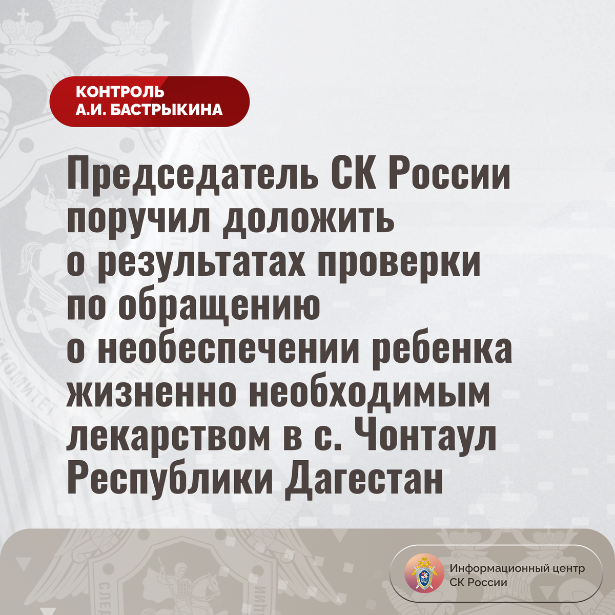 Председатель СК России поручил доложить о результатах проверки по обращению о необеспечении ребенка жизненно необходимым лекарством в с. Чонтаул Республики Дагестан В адрес Председателя СК России А.И. Бастрыкина через его приёмную «ВКонтакте» поступило обращение жительницы села Чонтаул Республики Дагестан по вопросу нарушения прав ее 13-летнего сына, страдающего аутоиммунным заболеванием. Для поддержания здоровья мальчику требуются регулярные инъекции препарата. Однако с января текущего года жизненно важное лекарство ребенку не выдается. Многочисленные обращения матери результатов не принесли. В СУ СК России по Республике Дагестан начата процессуальная проверка. Председатель Следственного комитета Российской Федерации Александр Иванович Бастрыкин поручил руководителю СУ СК России по Республике Дагестан Дмитрию Владимировичу Беляеву представить доклад о ходе и результатах процессуальной проверки, поставив ее на контроль в центральном аппарате ведомства. #СледственныйКомитет #СКРоссии #С