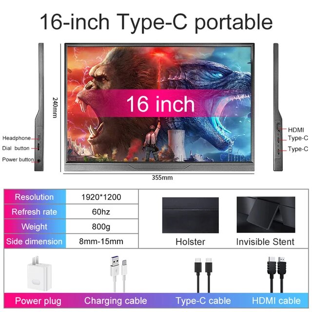 5. ⭐ Портативный монитор с сенсорным экраном 16/15,6/14 дюймов, FULL HD ЖК-дисплей, IPS-панель