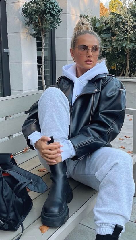 Добавьте к своему спортивному наряду кожаную куртку, и у вас получится максимально комфортный повседневный образ. Наконец, не забудьте добавить удобную пару белых кроссовок.