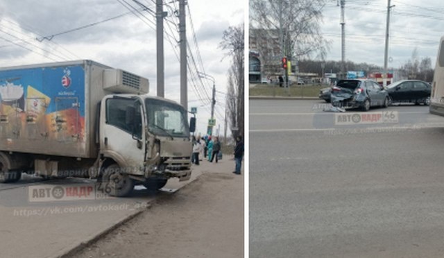 По предварительной информации очевидцев, которые выложили фото с места в паблике «Автокадр_46», на улице 50 лет Октября в районе автовокзала столкнулись автомобили. От удара грузовую машину выбросило на тротуар, легковушка получила значительные повреждения.
