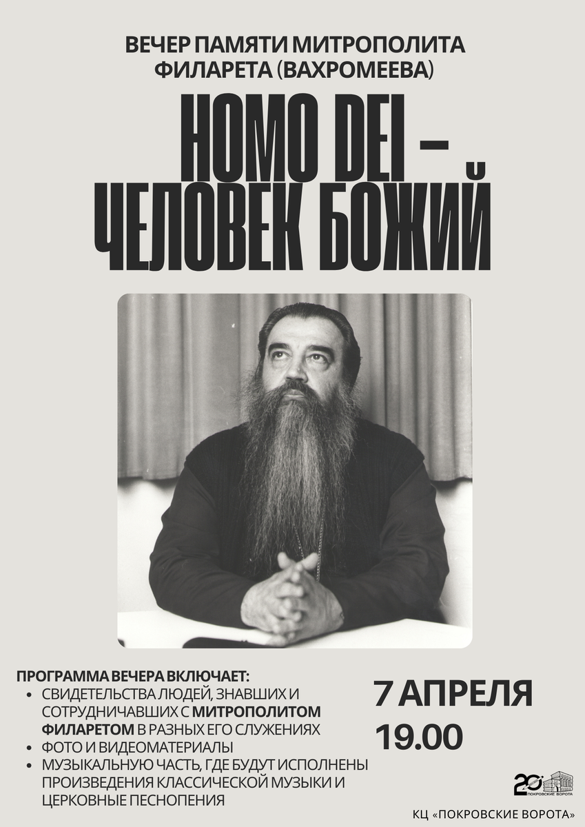 Вечер памяти митрополита Филарета (Вахромеева) 21 марта 2025 года исполнилось бы 90 лет со дня блаженной памяти митрополита Филарета (Вахромеева) – выдающегося церковного деятеля и пастыря, оставившего яркий след в церковной истории и в сердцах всех, кто имел счастье быть с ним знаком. Митрополит Филарет был соучредителем культурного центра «Покровские ворота» через Христианский образовательный центр им. свв. Мефодия и Кирилла в Минске. На вечере выступят: - Архимандрит Филарет (Булеков) – заместитель председателя ОВЦС - Ольга Седакова – поэт, доктор богословия Европейского гуманитарного университета (Минск) - Протоиерей Николай Коржич – благочинный, настоятель храма благоверного князя Александра Невского (Минск) - Протоиерей Владимир Шмалий – секретарь Синодальной Богословской комиссии (1999–2015) - Александр Кырлежев – сотрудник Синодальной библейско-богословской комиссии Программа вечера включает: - Свидетельства людей, знавших и сотрудничавших с митрополитом Филаретом в разных ег