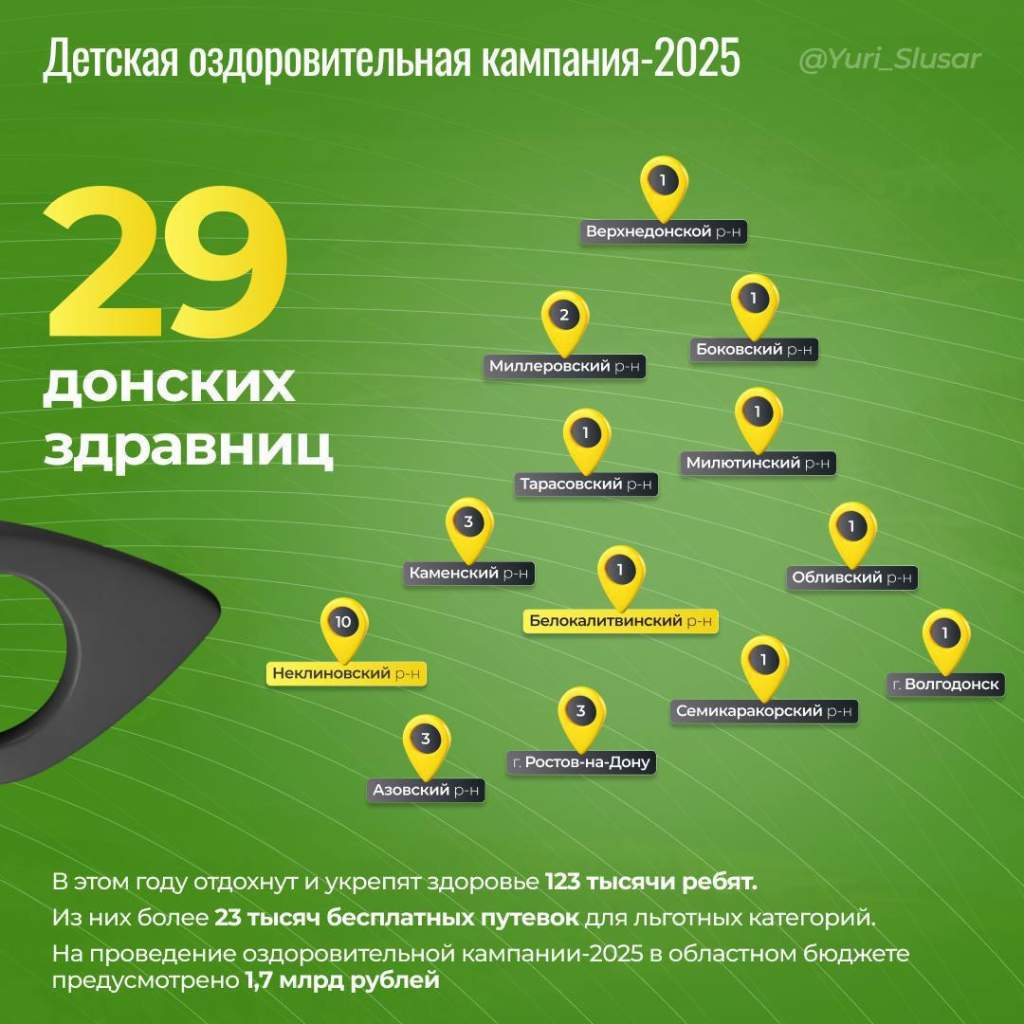 В Ростовской области стартовала оздоровительная кампания для школьников школьников 24 марта 2025 года в Ростовской области стартует детская оздоровительная кампания. Первыми отправились в санатории 1000 юных дончан — дети участников СВО и дети из малоимущих семей. Ребята проведут три недели в оздоровительных учреждениях донского региона и Северного Кавказа. Там ребят ждут не только новые впечатления и знакомства, но и процедуры по лечению органов дыхания, сердечно-сосудистой системы, опорно-двигательного аппарата. Врио губернатора казачьего края заявил о готовности ростовских детских санаториев к сезону. Также Юрий Сдюсарь поделился соответствием санитарно-эпидемиологическим требованиям здравниц. «Конечно, обеспечена противопожарная и антитеррористическая безопасность. Все лагеря проходят строгие проверки, и мы уверены, что каждый ребенок будет находиться под надежным присмотром», — поделился Юрий Слюсарь Фото: www.donland.ru