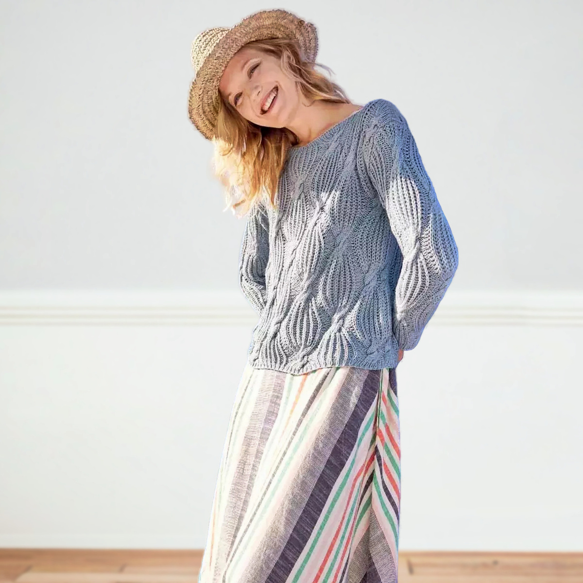 Для вязания нам потребуется 500 (500) 550 г серо-голубой пряжа: 65% хлопок, 25% вискоза, 10% лён; 110 м/50 г. Спицы № 3 и 4. А также круговые спицы № 3.