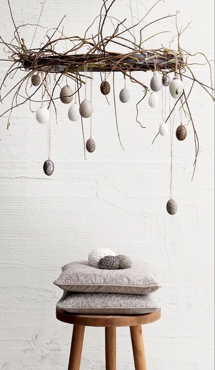 Декор: Подвесить на тонких ленточках, леске или цепочках декоративные пасхальные яйца разного размера и цвета. Яйца могут быть: