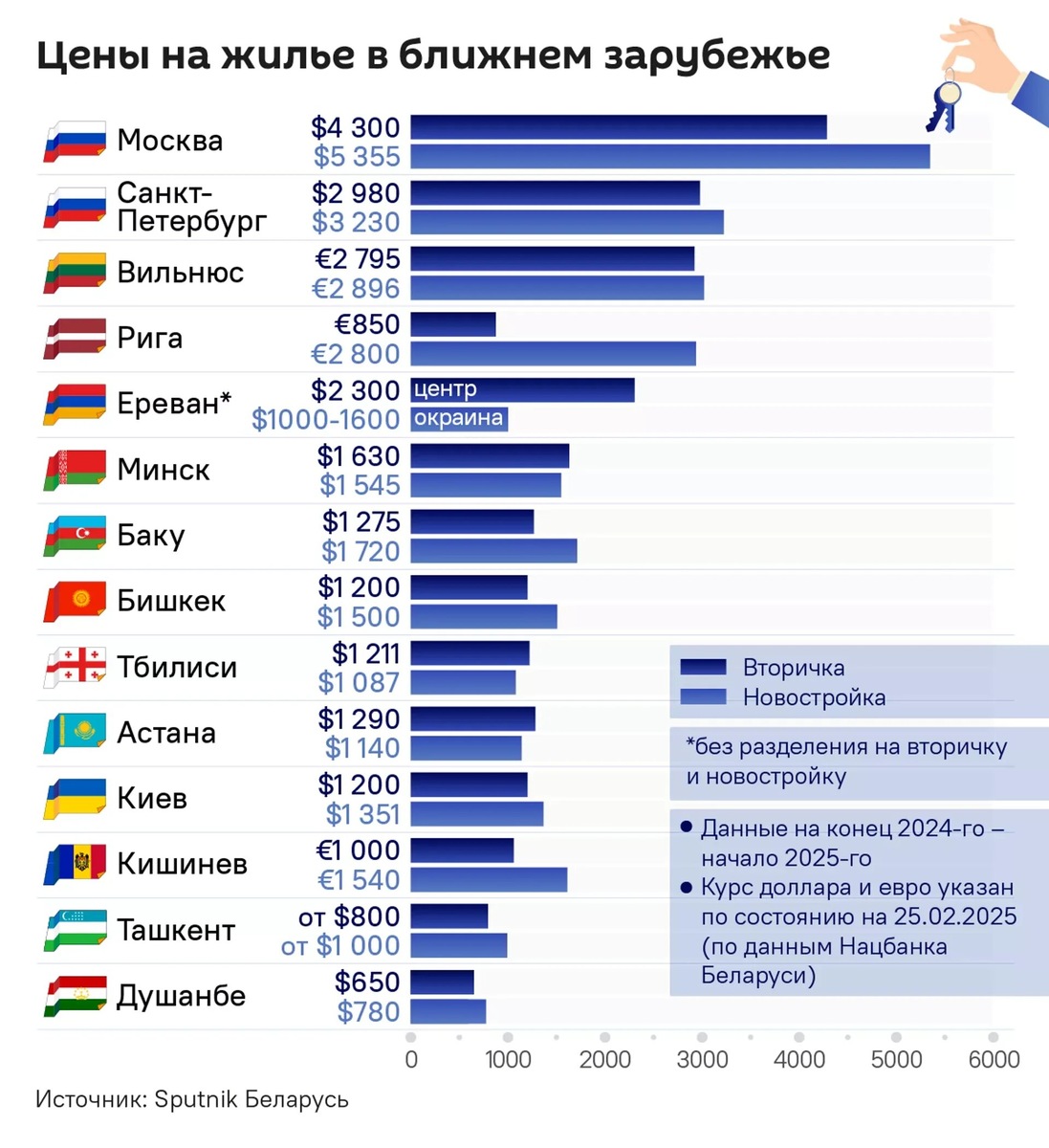 Эксперты новостного агентства Sputnik провели анализ цен на недвижимость в столицах стран бывшего СССР. Они выяснили, где можно приобрести жильё по самым высоким и низким ценам в начале 2025 года. В основе исследования лежат данные кадастровых организаций и агентств недвижимости. В большинстве стран ближнего зарубежья цены указаны на однокомнатные квартиры стандартного качества на вторичном рынке и в новостройках. Для удобства стоимость одного квадратного метра приведена в долларах, а в некоторых столицах — в евро. Курсы валют взяты на 25 февраля 2025 года. Цены на квадратные метры по данным конца 2024 — начала 2025 года. Лидером по цене за квадратный метр стала Москва. Это неудивительно, учитывая статус одного из крупнейших мегаполисов мира и одного из наиболее динамично развивающихся городов на планете. В Москве стоимость квадратного метра на вторичном рынке в среднем составляет 4300 долларов, а в новостройках — 5355 долларов. В 2025 году ближе всего к нам по цене будут следующие ст