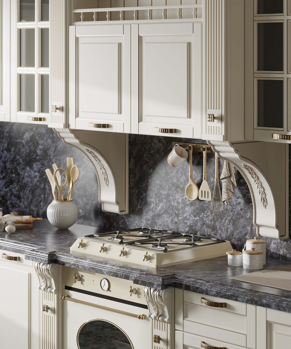 Мы предлагаем специальные порталы для вытяжек, оформленные в том же стиле, что и вся кухонная мебель. Такой портал визуально объединяет вытяжку с остальными элементами и создаёт впечатление единого целостного ансамбля. При этом он не только украшает интерьер, но и обеспечивает дополнительное место для хранения. Полки или шкафчики, встроенные в портал, отлично подходят для размещения кухонной утвари, специй и прочих необходимых мелочей, которые хочется держать под рукой.