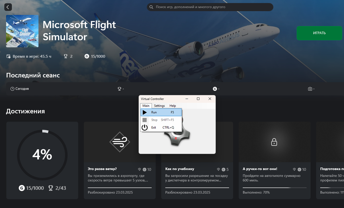 Всех приветствую! Буду краток. Что необходимо: 1. Скачать программу Virtual Controller и файл 2mod.vcd (ссылка тут). 2. Запустить программу. Добавить виртуальный джойстик (Settings- IO Devices - Virtual - Setup - Xbox360 Gamepad). Перезагрузить ПК. 3. Добавить файл настроек 2mod.vcd через Settings - Load. 4. Запустить программу. Нажать Main - Run. Играть. По умолчанию в файле профиля я настроил на включение режима полета кнопку "1" (взять штурвал в руки, управление элеронами и рулем высоты), кнопка "2" режим земли (управление рулем-рудером и элеронами) и отключение режима управления мышкой клавишей "3" (отпустить штурвал). Можно изменить кнопки в Settings - Controls. Также советую поиграть с чувствительностью и мертвыми зонами геймпада в самой игре. Ну и на последок выключить управление камерой геймпадом, чтобы нормально пользоваться мышкой для "вертения" головой в салоне (убрать все привязки камеры к левому стику): Всем отличных полетов!