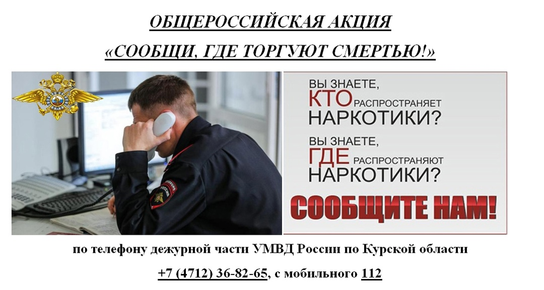 ☎ Сообщать о фактах незаконного оборота наркотиков следует по телефону дежурной части УМВД России по Курской области: + 7 (4712) 36-82-65 или по номеру 112.