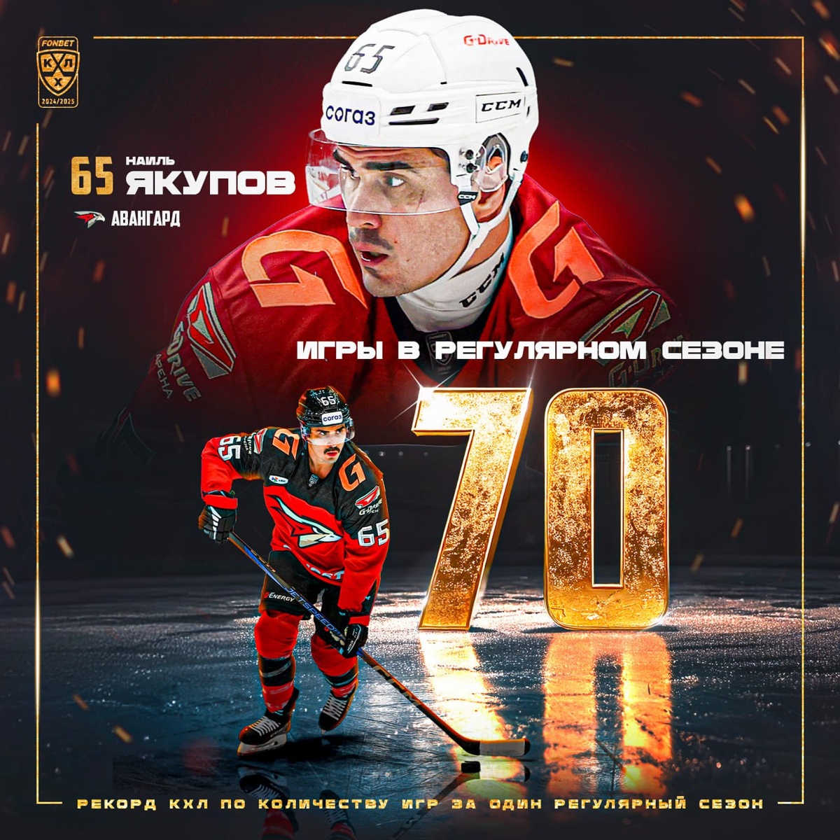 Провести 70 игр в 68-матчевой регулярке?! Для Наиля Якупова 🦅 нет ничего невозможного! Нападающий установил новый рекорд КХЛ по количеству сыгранных матчей в одном регулярном сезоне: 27 за «Куньлунь» + 43 за «Авангард» = 7️⃣0️⃣