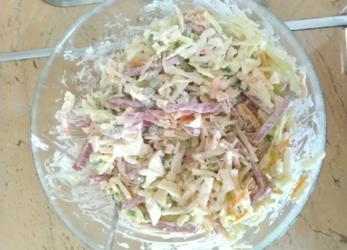 Капусту шинкуем средне. Слегка ее примнем с солькой. Сильно не нужно. Огурцы, помидоры, колбаску режем соломкой. Смешиваем с капустой. Заправляем майонезом, поперчим!