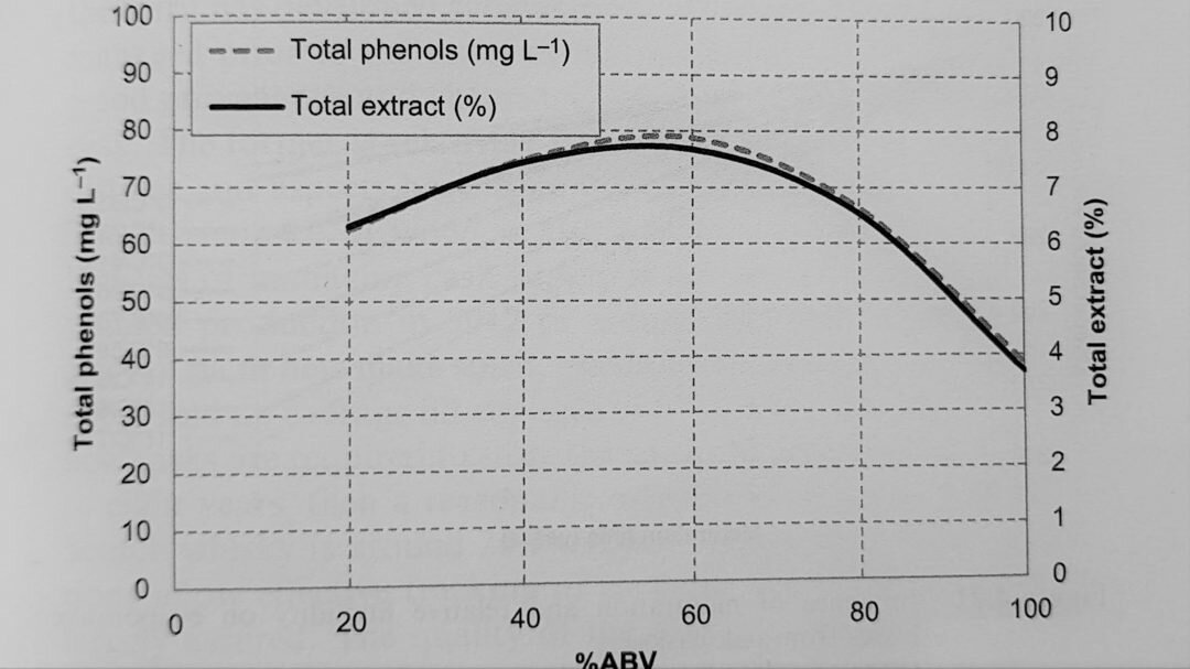 Научные исследования показали, что при объёмной доле этанола в районе 58% в водно-спиртовой смеси достигается максимально возможное взаимодействие между бочкой и дистиллятом – он вбирает в себя наибольшее количество элементов из дерева. Разная работа спирта с деревом объясняется тем, что разное сочетание объёмов воды и этанола в растворе (точнее, разное поверхностное натяжение, вязкость и растворяющая способность таких смесей) по-разному проникает в дерево и извлекает находящиеся там компоненты. А вода и этанол «вымывают» из дерева разные составляющие. Алкоголь “работает” с липофильными соединениями, со стеролами, с лактонами, с производными лигнина. Вода же растворяет сахара (арабиноза, глюкоза, ксилоза, фруктоза), танины, глицерол, гемицеллюлозы.