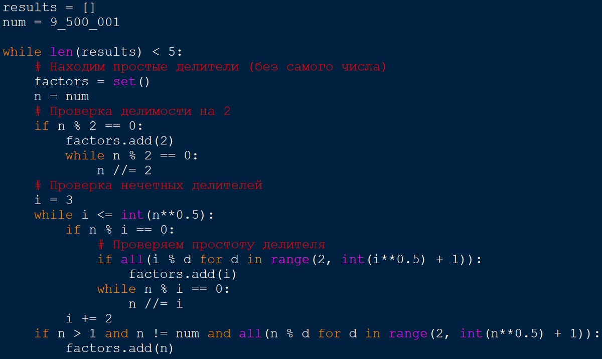 Количество строк для записи ответа избыточно. Обозначим через M сумму максимального и минимального числа среди простых делителей целого числа, не считая самого числа. Если таких делителей у