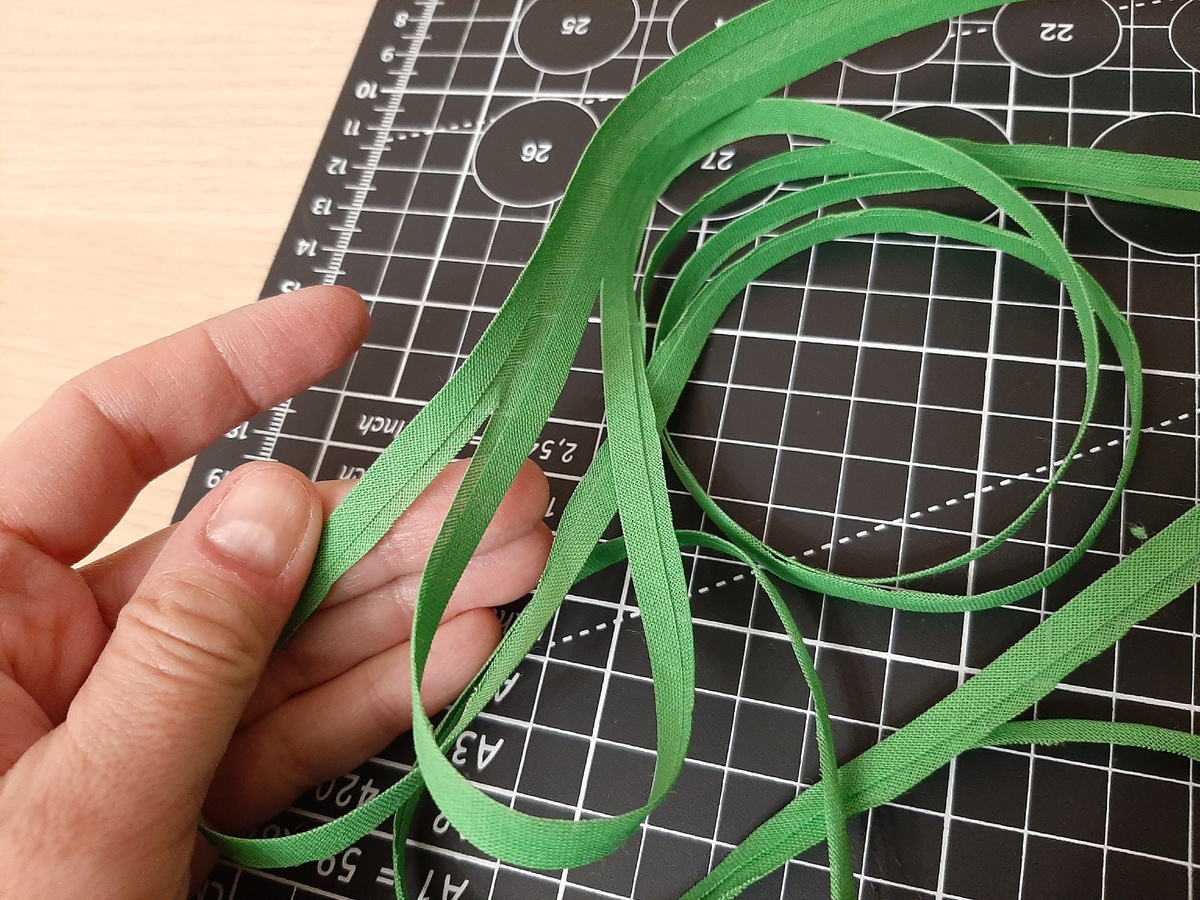 В феврале жутко захотелось весны в творчестве: в голове вырос образ мимозы, символизирующей обновление природы, надежду, являющейся неотменным атрибутом женского праздника. Вот и купила миниатюрные желтые помпоны и зеленую косую бейку. Но, начав творить, заболела: вирус уложил в постель на неделю - к 8 Марта не успела, а закончила только сейчас. Впрочем, проект оказался долгоиграющим не только из-за простуды: листья цветка я планировала сделать реалистичными и погрязла в механической работе. Косую бейку шириной в 1,5 см разрезала вдоль вдвое и каждую половину свернула жгутиками, чтобы настрочить их на тканевую основу, предварительно проклеенную флизелином. В первый вечер успела немного: примерно третью часть одного листа. Пытка зелеными прожилками длилась и во второй вечер. Но для целого листа пришлось потратить три дня. Первый лист получился "ровнее", чем хотелось, но не расстроилась, решив, что этот недостаток отлично закроют желтые соцветия. Но к ним я приступила почти че
