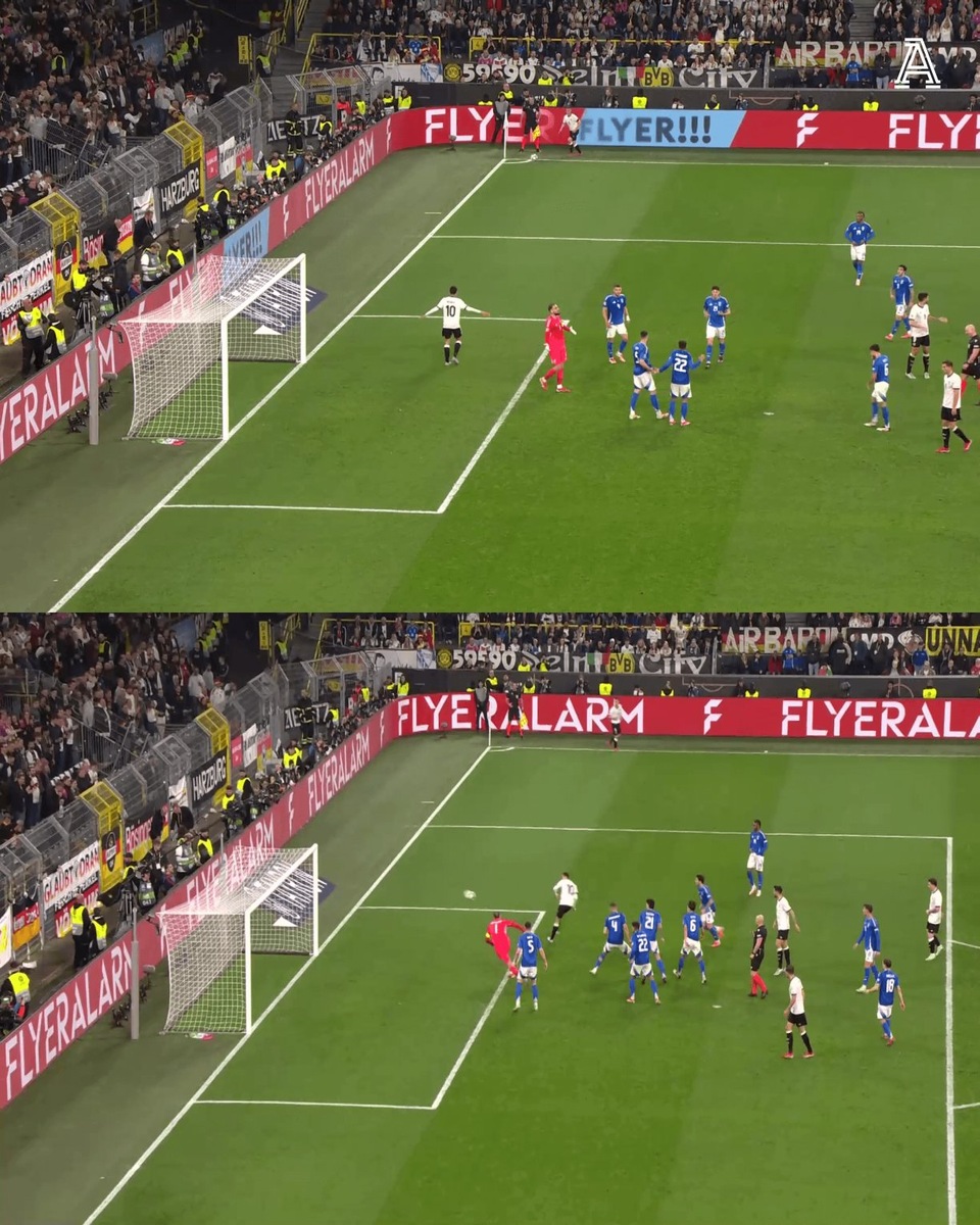 Джанлуиджи отразил опасный удар соперника, увел мяч на угловой и тут же начал общаться с товарищами по команде. Пока итальянцы были заняты разговорами, немцы разыграли стандарт: Киммих низом отправил мяч Мусиале, Джамалу оставалось забить в пустые ворота.