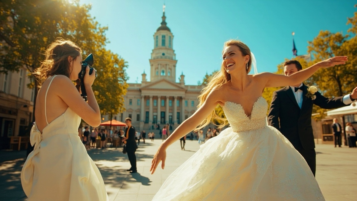 И тут у здания мэрии я заметила их — свадебную процессию. Невеста в пышном белом платье, жених в душном костюме, толпа нарядных гостей и фотограф, который суетился, пытаясь поймать удачный ракурс.