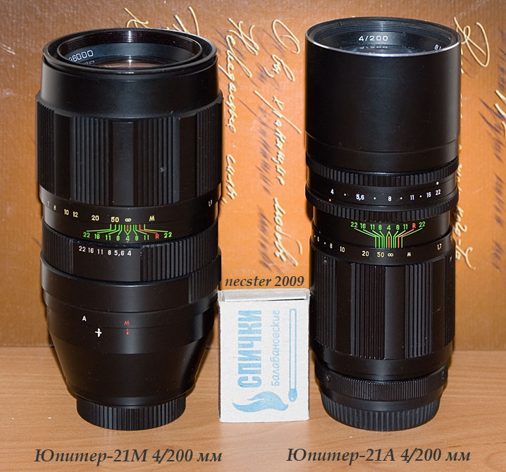 Продолжая разговор о 200 мм объективах обязательно нужно упомянуть Юпитер-21 со светосилой f/4. Он выпускался КМЗ (Красногорск, Юпитер-21А) и ВОМЗ (Вологда, Юпитер-21М). У них разные оправы, вес, количество лепестков и минимальная дистанция фокусировки. Приведу фото внешнего вида и ТТХ в сравнении с Телемар-22.
