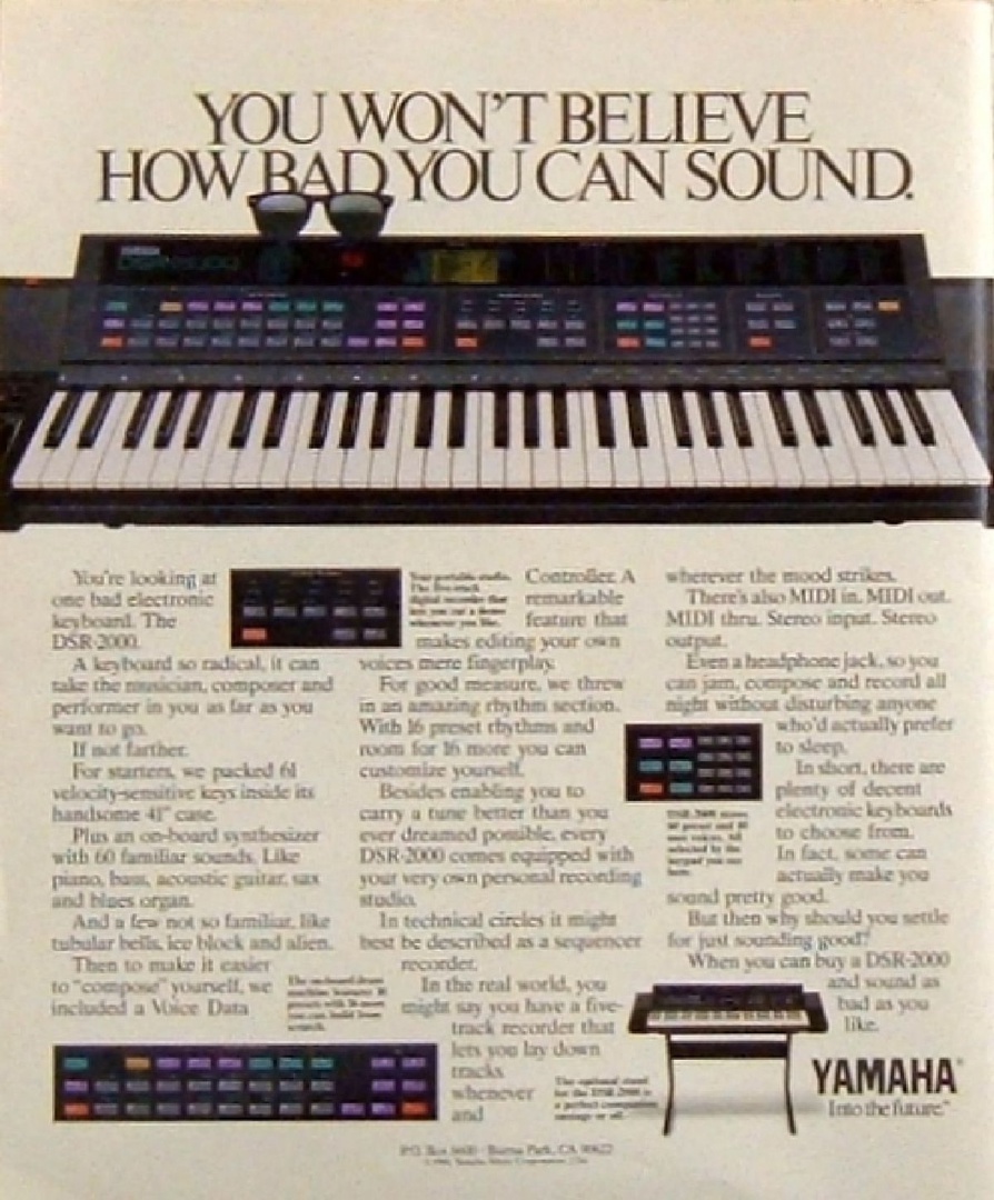 Перевод рекламного проспекта (возможно даже из журнала) «You won't believe how bad you can sound» Вы смотрите на одну плохую электронную клавиатуру - DSR-2000. Она может завести музыканта, композитора и исполнителя так далеко, как вы захотите. Если не дальше. Для начала мы разместили 61 чувствительную к скорости клавишу в красивом 41-дюймовом корпусе. Плюс встроенный синтезатор с 60 привычными звуками. Например, фортепиано, бас-гитара, акустическая гитара, саксофон и блюзовый орган. И несколько не очень знакомых, таких как tubular bells, ice block и alien. Чтобы было легче «сочинять», мы включили замечательную функцию Voice Data Controller. Функция, которая упрощает редактирование ваших собственных голосов (тембров) с помощью пальцев. Для пущей убедительности мы добавили потрясающую ритм-секцию. У вас есть 16 предустановленных ритмов и место для еще 16, которые вы можете настроить сами. Помимо того, что вы можете воспроизводить мелодии лучше, чем вы когда-либо мечтали, каждый DSR-2000