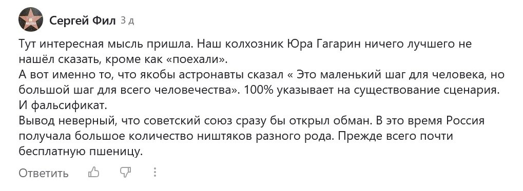Есть еще в наших рядах, назовем их так - люди глубоко заблуждающиеся. Моя недавняя статья, под названием "Американцы были на Луне! Простите конспирологи", вызвала просто бурю эмоций у одного нашего космического "друга".