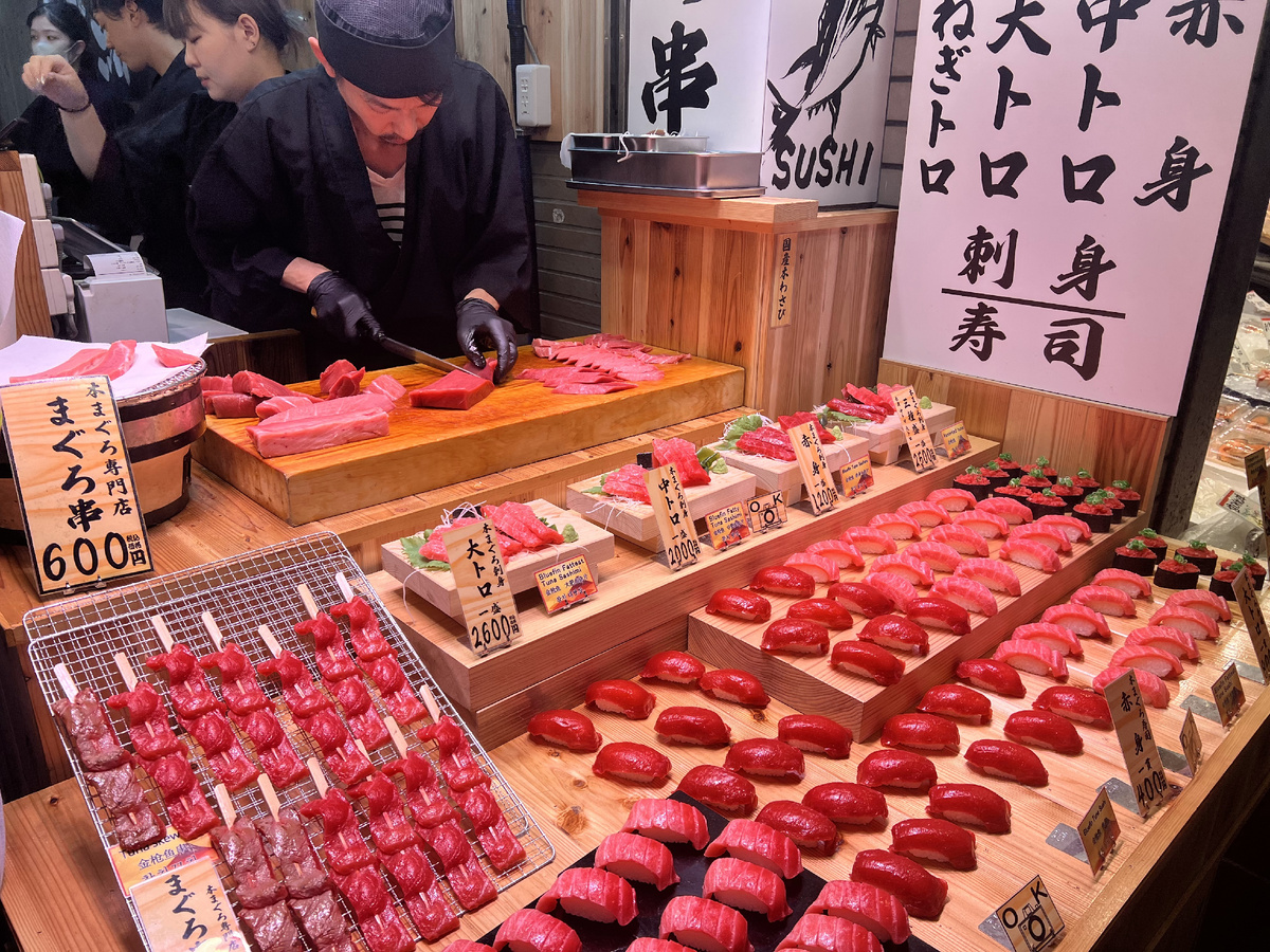 Поговорим про Японию. А точнее, про ее гастро сторону). Мы специально оставили рынок Нисики в Киото напоследок, чтобы досыта тут наесться морепродуктов и улететь в другую страну). На рынке продают сырые и готовые продукты, в том числе жареное мясо на палочках, плотные рисовые хлебцы и всевозможные соленья. Здесь также можно найти кухонную утварь, керамическую посуду, специи и пряности, изделия из бумаги и необычные сувениры. Я впервые попала в место, где хотела съесть все))). На всех прилавках лежало чудо). Чудо из рыбы и других морепродуктов). Вы только посмотрите, КАК тут выложена продукция! Насколько все аппетитно и красиво ! Название рынка переводится с японского языка как «рынок парчи». Он расположен в центре города, представляет собой узкую улицу с торговыми площадями протяжённостью около 400 метров. Скажу сразу. Деньги несите сюда сразу наличными). Ни о каких картах, а тем более переводах на карту Сбер тут речи быть не может))))))). Шутка. Мы понадеялись, что хотя бы гд