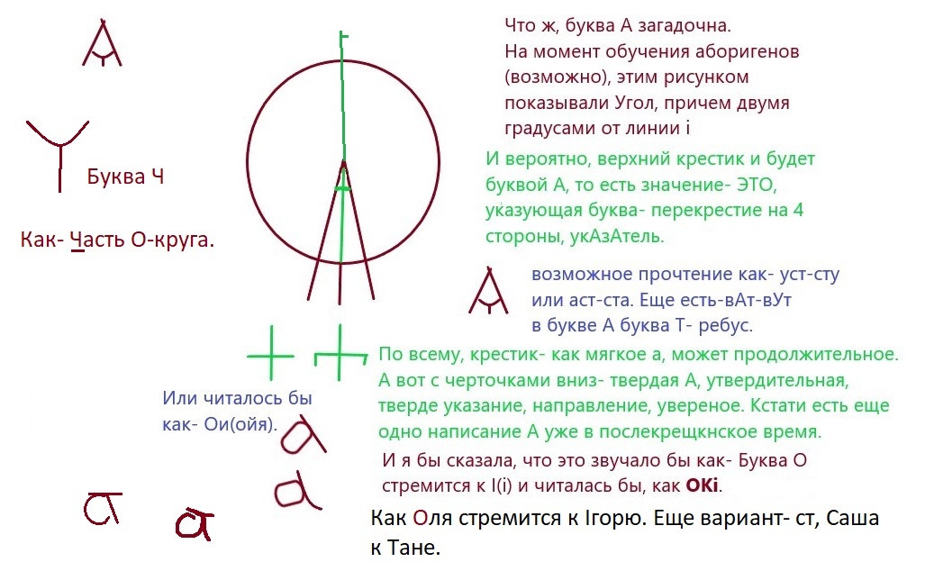 Прочтение и озвучивание буквы i у нас было бы как- АЙ или ЙЯ, что включало бы в себя понятие начального бесконечного. Ту саму ось i равносильную букве А, как понятию- ЭТО. i (ай- это малая часть- толика от целого) и ставилась бы она в конце, например- воронi- это малый ворон от всех воронов. Роi- moi-читается совсем как не русские буквы. А если буквы русские были, а писали по своему? Транскрипция. Например - А ЭТО буква Б. Запишем- a iто bukva В. Рой-й-это малая часть разума общего от всех пчел как общеразумных. Ведь у пчел в целом коллективный разум. Мой мяч- малая часть моего окружения из всего общего моего. В английском языке буква i- так и осталась ай и буква А читается тоже как ай. Может они запутались потом? )) Как жаль, что я не могу показать тут образы )))) Так вот, почему же я так думаю. Потому что дело в градусах и углах. И в руках. Есть мысль, что было много рукописного текста, а носитель языка как без рук. Ибо даже глаголица как срисована с разных значков или обозн