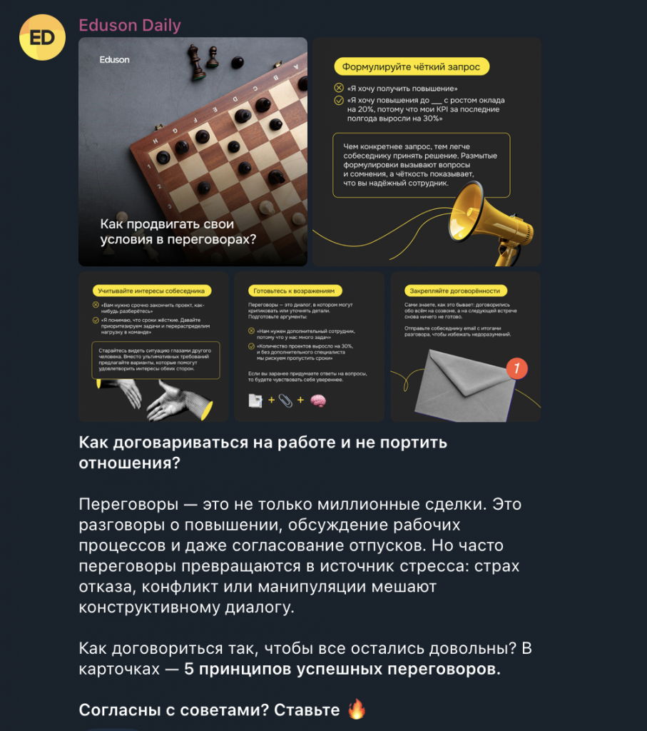 Это могут быть подборки, инструкции, чек-листы или шаблоны. Например, разбор ошибок, которые допускают новички в SMM, или советы по написанию резюме.