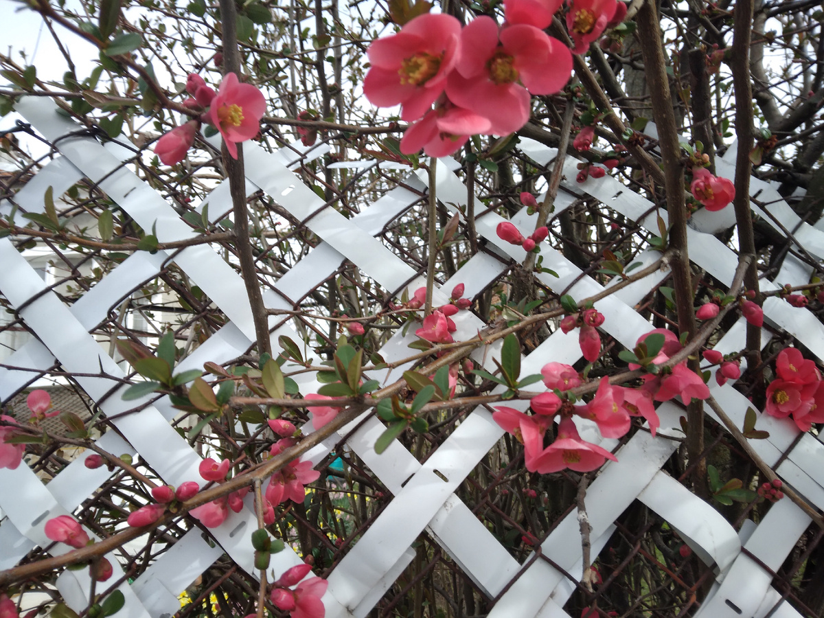Тепло, хотя и пасмурно. Вчера вечером Джесси явилась с гулянки с подбитым глазом. Слышу за дверью жалобное поскуливание, открываю- там Джеська , у которой правый глаз превратился в щёлочку и заплыл. Крови на морде нет. Ну, что? Постаралась её успокоить. Промыла ей глаз, смазала тетрациклиновой мазью. Джеська забралась под бок к Сергею и уснула. Утром глаз у неё уже открылся, а сейчас только белок немного красноватый. Видимо, веткой в темноте хлестнуло по глазу или на какой- нибудь сучок наткнулась. Ничего, обошлось. Я думала, что будет хуже, так она пищала и причитала. Зацветают кусты японской айвы возле крыльца. Там по обыкновению кучкуются воробьи, прячась в сплетении ветвей, и звонко галдят. Прячутся они не зря- на днях прямо на моих глазах сокол- ветрушка спикировал на какого- то зазевавшегося воробья и его унёс. Этот сокол обычно сидит на вершине старого грецкого ореха, который растёт в углу участка, и караулит добычу. Соседний участок новые хозяева не только очистили от зарос