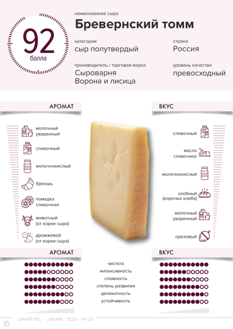 В этой статье хочу поделиться интересными образцами с прекрасным балансом органолептических характеристик, которые нам удалось попробовать в рамках исследования для журнала. Прекрасный по вкусовому балансу образец сыра, с приятным, объемным, обволакивающим сладко-сливочным и ореховым послевкусием. В целом сыр очень хорошего качества, с хорошим балансом во вкусе, дружелюбным ароматом. Хороший вариант для комбинации с другими сырами в составе сырной тарелки. Несмотря на «академический» внешний вид, сыр со сложным вкусовым и ароматическим профилем, длительным и объемным послевкусием. Хороший вариант для сырной тарелки или отдельного употребления. У сыра интересный и сложный ароматический и вкусовой профили. Во вкусе сыру не хватает жирной компоненты, которая сказывается на продолжительности и интенсивности послевкусия. Рекомендации к использованию в составе сырной тарелки, для самостоятельного употребления, и в качестве ингредиента холодных блюд. Сыр с интенсивной ароматикой и вкусом, неж