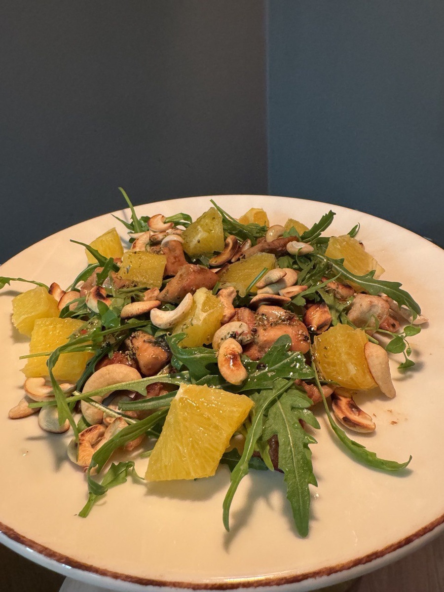 Ищете лёгкий, но сытный салат с идеальным балансом сладости, пикантности и хруста? Этот рецепт с рукколой, апельсинами и маринованной курицей станет вашим новым фаворитом! Рассказываю, как приготовить его за 15 минут и удивить даже гурманов. Ингредиенты (на 2 порции): - Куриное филе — 300г (маринад: 2 ст.л. соевого соуса + 1 ч.л. мёда). - Руккола — 1 пучок. - Апельсины— 2 шт. (для салата и соуса). - Кешью — 50 г (обжарить на сухой сковороде до золотистости). Для соуса: - Сок ½ лимона+ сок ½ апельсина. - Дижонская горчица — 1 ч.л. - Оливковое масло — 3 ст.л. - Орегано — щепотка. - Соль, перец — по вкусу. Как приготовить: 1. Маринуем курицу: Смешайте соевый соус с мёдом, залейте филе и оставьте на 5-10 минут. Обжарьте на гриле или сковороде до румяной корочки, затем нарежьте ломтиками. Параллельно обжариваем кешью 1-2 минуты. 2. Собираем салат: На тарелку выложите рукколу. Очистите апельсин от кожуры, нарежьте дольками или кружочками. Добавьте курицу и кешью. 3. Готови