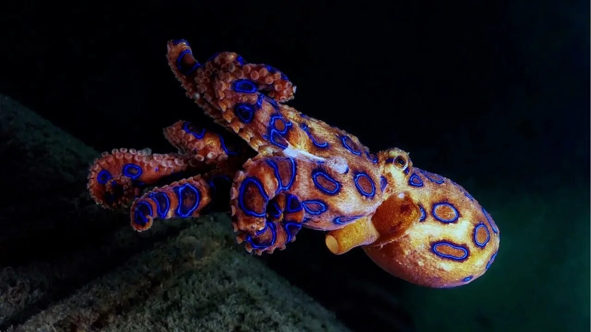 🔹 Как выглядит? Размером с мячик для гольфа, но при угрозе на его теле вспыхивают ярко-синие кольца. Важно: Противоядия не существует! Если укусил — немедленно нужна искусственная вентиляция легких. 🔹 Почему опасна? Её яд вызывает невыносимую боль и может привести к летальному исходу.