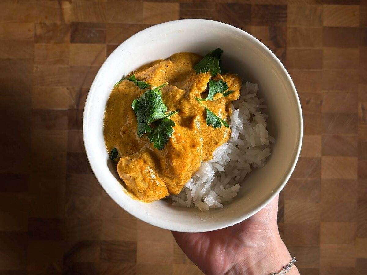 Наконец-то мы отправляемся за гастрономическими удовольствиями не только в Европу! День Индии! Готовим курицу в сливочном масле или баттер чикен, или мург махани. Историческая сводка: блюдо придумали только в прошлом веке и появилось оно, когда повар одного из индийских ресторанов решил "уработать" остатки курицы от какого-то другого блюда, замариновал его в йогурте и "добил" это все до полноценного блюда, которое мы знаем и любим! Что ж, не будем терять ни минуты, бежим готовить! 1. Режем куриное филе на крупные кубики. Добавляем к курице йогурт, лимонный сок, молотый тмин и гарам масалу. Перемешиваем. Убираем в холодильник мариноваться минимум на 1 час. 2. На сковороде топим сливочное масло. Засыпаем мелко нарезанную луковичку. Жарим до прозрачности, помешивая. 3. Мелко трем свежий имбирь (чтобы получилась 1 столовая ложка), давим чеснок. Добавляем их к луку, обжариваем еще пару минут. 4. Добавляем специи: тмин, гарам масалу, кориандр, чили, куркуму, соль, сахар. Перемешиваем и