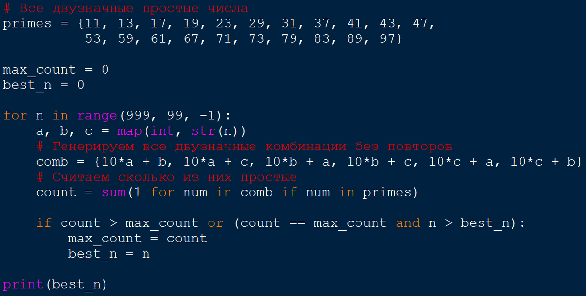 Автомат получает на вход трёхзначное число. По этому числу строится новое число по следующим правилам: 1) Из цифр, образующих десятичную запись N, строятся все возможные двузначные числа (числа не могут начинаться с нуля). 2) Из получившихся двузначных чисел выбираются только те, которые являются простыми. Каждую цифру трехзначного числа можно использовать ровно столько раз, сколько она встречается в этом числе. К примеру, возьмем число 123. Из него