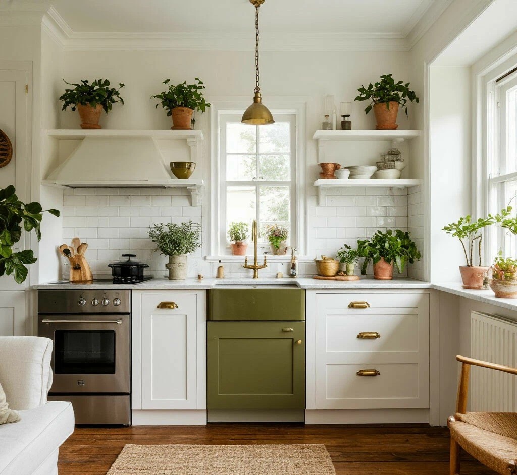 🔹 Пример: Кухня-гостиная в белых тонах с оливковым и медными ручками.